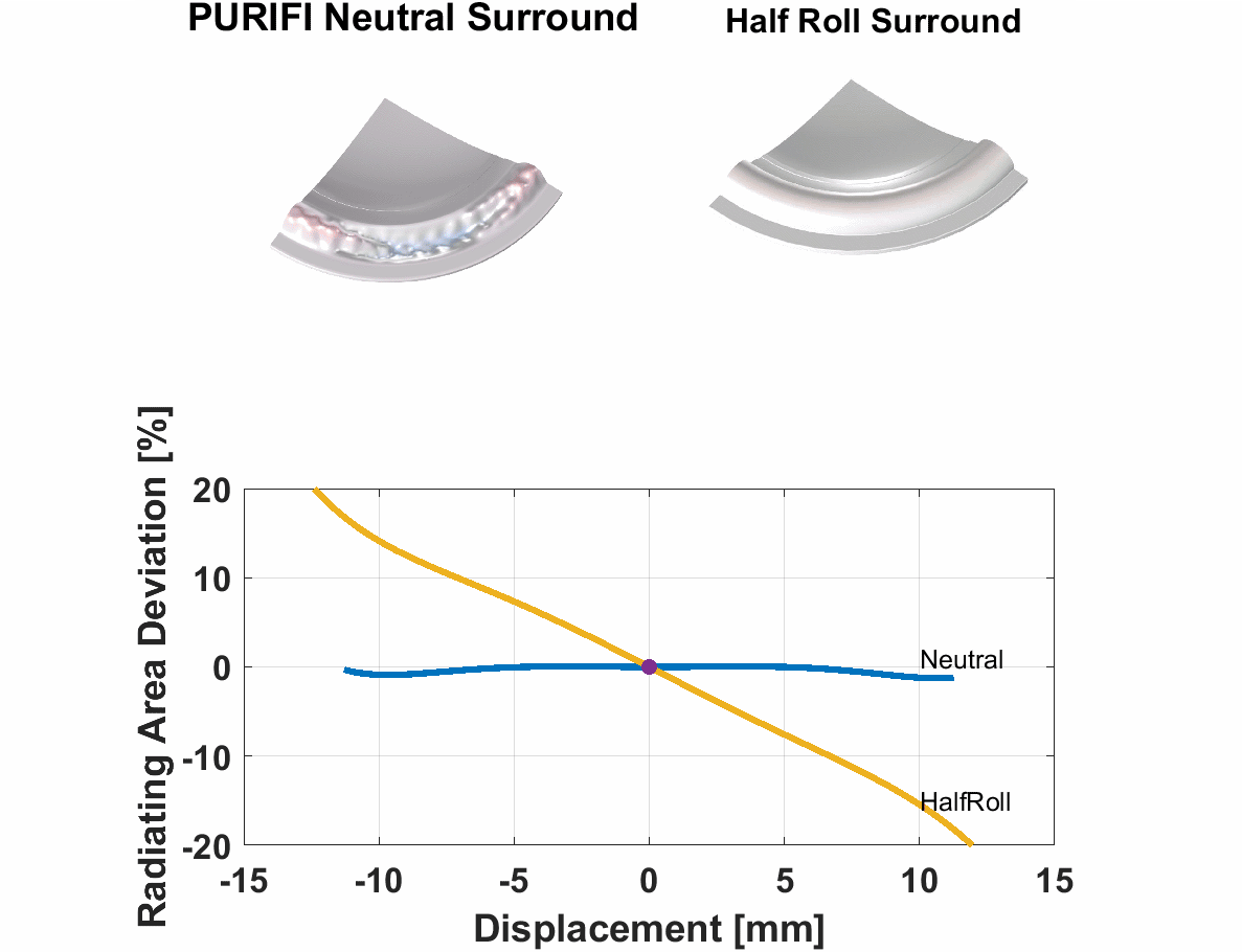 A standout feature is the “NeutralSurround” edge suspension. With its mountain-like design, it can maintain a consistent diaphragm area even during large fluctuations. Unlike standard suspensions that often cause sound distortion, especially IMD when frequencies overlap, this mirror-symmetrical design ensures almost no deviation in the radiating area, maintaining superior sound quality even in the most complex tracks.
