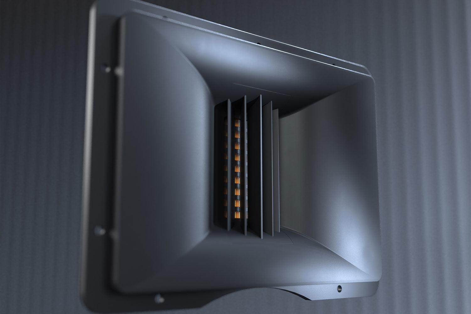 What sets this waveguide apart from nearly all other waveguides is its dual function: while the shape of the waveguide itself narrows the tweeter’s directivity to perfectly match the woofer around 2400 Hz, the aforementioned fins also help broaden the AMT’s dispersion at higher frequencies.
