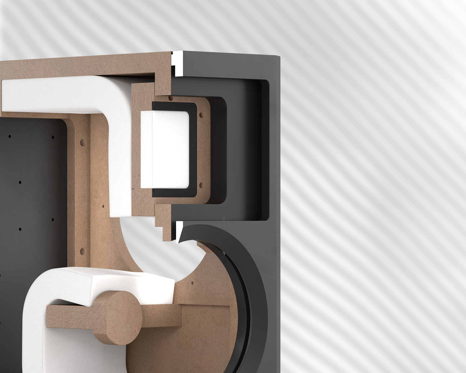 15 mm MDF cabinet with horizontal bracing and Basotect® foam reduces distortion and absorbs backward sound.