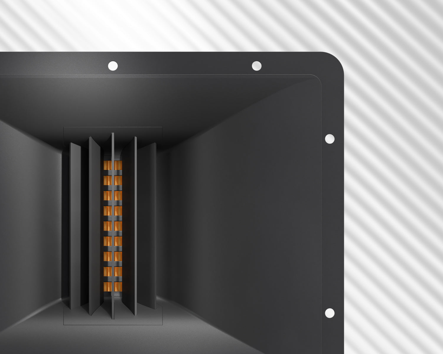 Custom high-frequency dual-purpose beam expansion waveguide for a wider sweet spot and a smooth transition between woofers and tweeter.