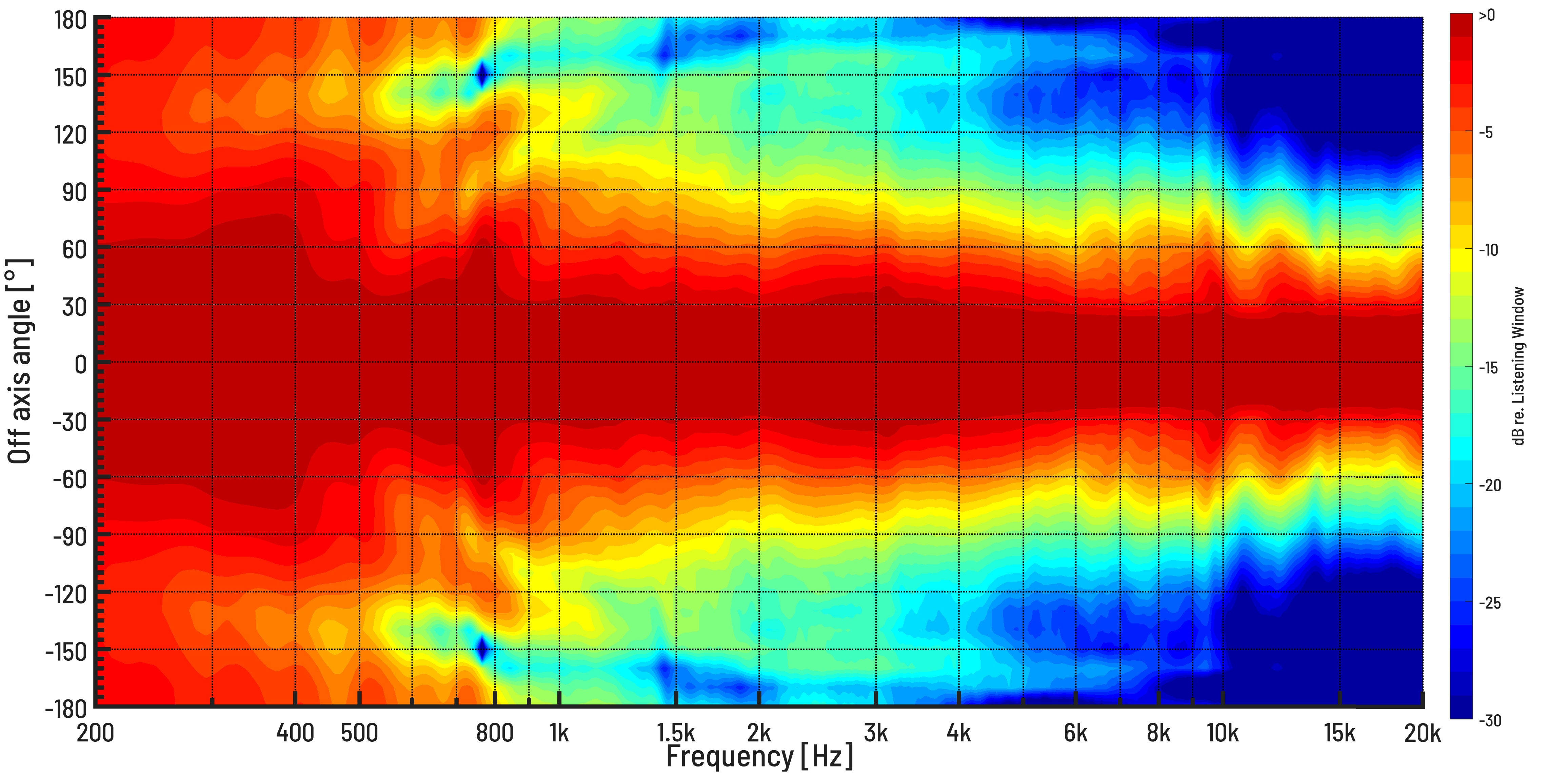The horizontal polar response at the tweeter height was recorded in 10-degree steps. The plot shows the response normalized to the Listening Window (i.e. average over 0-30 deg).